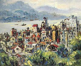郭東榮 淡水風景/1990/油畫/38x45.5cm 以快速的筆調及活潑的筆觸、顏色將淡水鋪陳的如此清新及 雅緻。 郭東榮簡歷(1927-) 1927 生於嘉義 1955 國立師大第一名畢業 日本早稻田大學碩士、東京藝大碩士 日府賞金爵賞獲獎二十多次,並擔任日府展常務理事評審委 員
