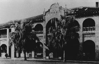 1916年吳威廉牧師設計此樓優美的拱廊映襯椰子樹的長影此 照片攝於1940年,當年為〔淡水高女〕,戰後為純德女中, 後來和淡中合併為〔淡江中學〕。