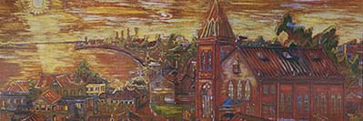 這是我的第一幅畫,是五十歲那年完成的。我花了兩個星期的工 作天,一寸一寸的摸索、塗抹。在這幅畫的前幾年,我太太生了一場 大病,不得不收起樓下的文具店;文具店剩了一堆沒有賣出去的油畫 顏料,而樓上因為整修房屋剩下很多三夾板,我就用那些油畫顏料和 廢棄的三夾板,畫我西窗外的淡水風景。(李永沱) (作品及文字錄自《李永沱樸素畫集》)