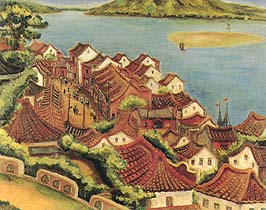- 早期知名畫家中,描繪淡水最力者,首推陳澄波。自1934到 1936年間,陳澄波每年都到淡水寫生;經常用50號以上的巨 幅描繪整條街景。陳澄波筆觸強烈、曲撓拙重的風格,用來 繪寫古樓毗臨、兼具山城港都特色的淡水,風格敵的確不凡 。「淡江風景」(1935,第九屆臺展無鑑查)、「淡水」(1935) 、「淡水高爾夫球場」(1935)、「曲徑」(1936)、「岡」(1936 ,又名「淡水中學」)均是名作。(節錄「伊誰來繪涉淡水