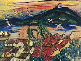 陳月里 圓舞的和樂/1993/油畫/91x116.5cm 陳月里和李永沱一樣皆為淡水素人畫家的代表。老來淡水蟄 居作畫的她,單純執著的風格,流露出素人本性中的表現內 力。 陳月里簡歷(1926-) 1926 生於台北市萬華 1990 參加「中日素人畫家聯展」於時代畫廊 1991 參加「淡水美術紀事」於吸引力畫廊 1993 參加「私房菜展」於彩田藝術空間