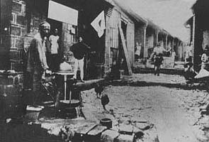 日據時代的重建街 這張模糊的照片,是今日重建街街景。由街頭所懸掛的太陽 旗,表示是在日據時代。圖中的水管頭(現已拆除)建成的 年代在1899年。街民留有髮辮,日治時代在1909才倡斷髮。 因此照片的年代應該介於這兩個時期之間。這是目前為止, 工作室所收集最古老的淡水街道照片。