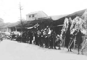 1944年,10月12日美軍突襲淡水,炸彈誤中三角公園,不少 鎮民遭池魚之殃,圖為吳姓居民舉行葬禮的情形。左起第二