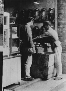 淡水中學的學生在大街的糖果店(雜貨店),當時的雜貨店 有餅干、糖果(架上的桶子),亦有小孩子最愛的抽獎,現 在已經很少了。攝于1940年。
