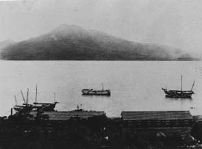 此照是由紅毛城俯瞰淡水稅關碼頭。日據初期稅關英國領事 館和臺灣銀行淡水辦事處,三者結合成一相當忙碌的港務區 。1945年中國憲兵第四團,即由此登陸。稅關戰後改為「基 隆關淡水支關」。