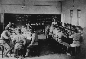 此照當年淡中上化學課的情形。黑版上可見昭和16年2月10日 之字樣,以英、日文授課。台下的學生十幾個人跼蹴地圍著 桌子上課,理小平頭、打綁腿,老師身著實驗服的情形,可