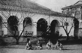 馬偕博士故居 馬偕博士在1875年購得(總稅務司署)旁的一塊土地,托嚴清 華負責建築工作,請水土師洪仔泉施工,磚瓦、福衫等建材都 購自廈門,這兩棟西班牙式白迴廊的洋樓今日保存于淡水工商 管理學院。本照片攝於1940年。